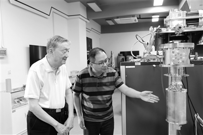 吴培亨院士(左)与青年教师张蜡宝(右)一起讨论新研制的超导器件。