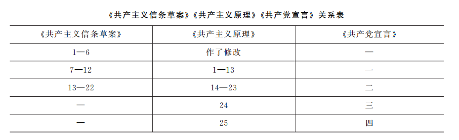 在马克思恩格斯经典文献的搜集和整理方面,苏联马克思主义专家的工作有开创之功,也因此成为《宣言》创作三稿本说的源头。依据巴加图里亚的解读,广义的《宣言》创作涉及马克思恩格斯通过世界观转变而渐次完成的思想和理论准备,可称为“前史”,时间大略在1842年至1846年;狭义的《宣言》创作则缘于马克思恩格斯与德国流亡工人组织的交集,特别是接受共产主义者同盟委托为其起草纲领,时间集中在1847年下半年至1848年初,由此获得的理论成果便是前面提及的三个稿本。巴加图利亚制作了一张说明三稿本关系的结构对照表。国内一些研究《宣言》创作史或传播史的学者常常援引这张对照表。这张对照表不仅坐实《宣言》创作的三稿本说,而且对三稿本说给予了结构化论证,特复制如下: