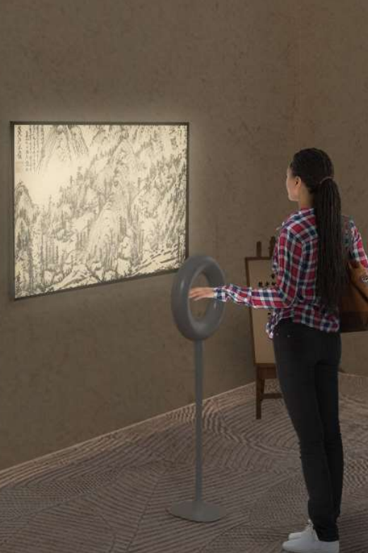 例如《笑傲江湖》作品,采用游戏引擎Unity制作,以“数字沈周”作品为原型,使用多通道渲染技术。观众现场创作,通过二维图像打描,绘制的“一叶扁舟”便能在“大师”的山水画中遨游,让人感受到数字化艺术魅力和创造性转化的神奇力量。再例如《幻境之纱》作品,通过数字投影与纱幕的交织,“黄公望”“沈周”“文徵明”和“仇英”的音容笑貌出现在眼前,观众还可近距离与“元四家”之首的“黄公望”进行一次隔空互动对话。