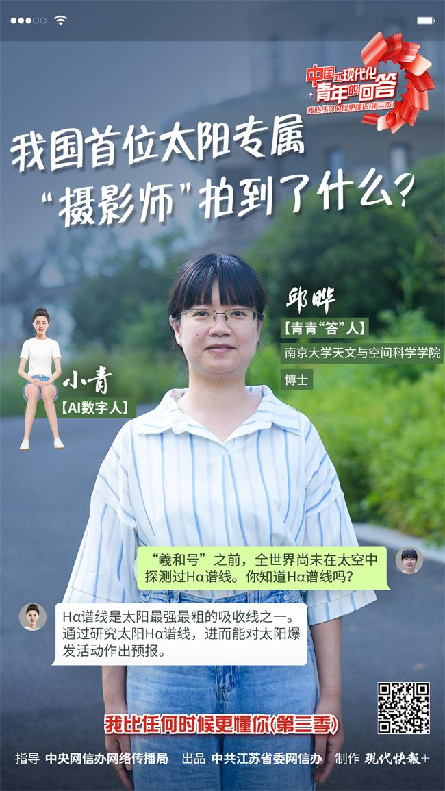 11 月 7 日," 中国式现代化 · 青年的回答——我比任何时候更懂你(第三季)" 系列短视频之《我国首位太阳专属 " 摄影师 " 拍到了什么?》正式上线。本集视频中,青青 " 答 " 人——凯发k8官网天文与空间科学学院博士邱晔和 AI 数字人小青,为大家展示了我国首颗探日卫星 " 羲和号 " 拍摄到的画面,解释了 " 羲和号 " 超长全称里的两个关键词的含义。