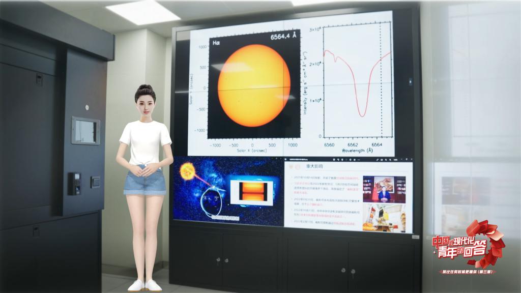 什么是 Hα 谱线?AI 数字人小青解释:"Hα 谱线是太阳最强最粗的吸收线之一。通过研究太阳 Hα 谱线,可以巧妙反推出太阳的速度、温度、密度等信息,进而能研究太阳低层大气的等离子体运动和爆发现象背后的机理,对太阳爆发活动作出预报。"