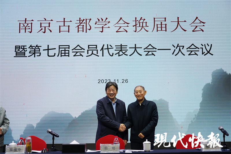 △ 凯发k8官网古都学会第六届会长杨新华(右)与第七届会长夏维中
