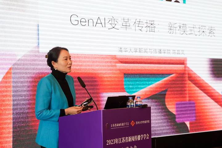 清华大学新闻与传播学院教授陈昌凤在《GenAI变革传播生产、机制与逻辑》报告中提出,人工智能已经进入到深层的应用阶段,在这一阶段,生成式人工智能正在革新知识生产方式,从而改变人类认知,也催生出新闻传播新模式。陈昌凤结合具体案例,从学术的视野,对策、采、编、审、发、评等整个新闻传播的业务流程如何推进数智化转型,作了深入的思考,并指出了中国在人工智能发展中面临的数据限制等挑战。