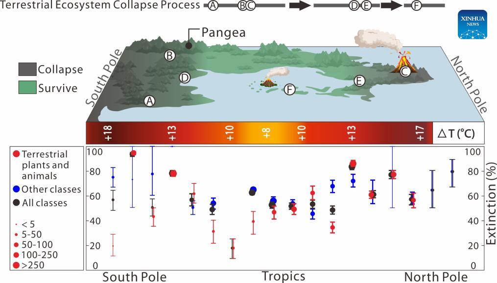 This image shows the pattern of terrestrial ecosystem collapse process at different latitudes at the end of the Permian period.(Xinhua)