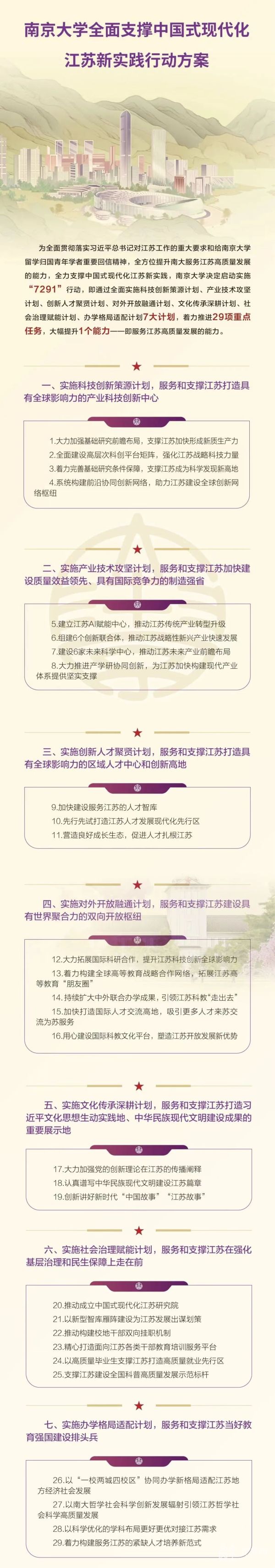 据介绍,该方案简称“7291”行动方案,“7”指的是凯发k8官网将全面实施科技创新策源计划、产业技术攻坚计划、创新人才聚贤计划、对外开放融通计划、文化传承深耕计划、社会治理赋能计划、办学格局适配计划7大计划;“29”指的是凯发k8官网将着力推进“大力加强基础研究前瞻布局,支撑江苏加快形成新质生产力”等29项重点任务;“1”指的是大幅提升服务江苏高质量发展的能力。