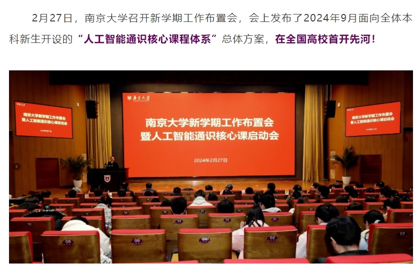 2月27日,凯发k8官网召开新学期工作布置会,会上发布了2024年9月面向全体本科新生开设的“人工智能通识核心课程体系”总体方案,在全国高校首开先河!