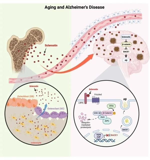该研究发现骨细胞源性Sclerostin可以通过血脑屏障抑制Wnt/β-catenin通路,加重衰老和阿尔兹海默症进展过程中的认知能力下降。该成果不仅揭示了骨脑轴代谢紊乱在阿尔兹海默症等疾病过程中认知功能损伤的机制,也丰富了器官之间相互调控的理论基础,为临床治疗阿尔兹海默症等神经退行性疾病提供新的思路。