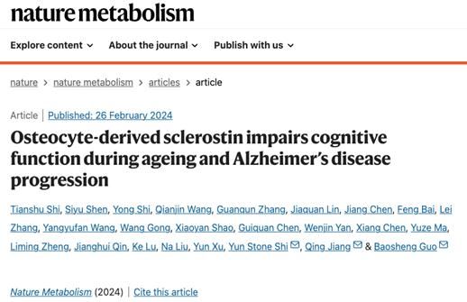 凯发k8官网医学院郭保生副教授、蒋青教授团队与石云教授团队发现了骨脑轴代谢紊乱加速病理状态下认知功能损伤的新调控机制,这是国际上首次发现骨质疏松可加速认知功能衰退,为临床治疗阿尔兹海默症等提供新思路。相关研究成果于2月26日在线发表于国际顶级期刊《自然·代谢》(Nature Metabolism)。