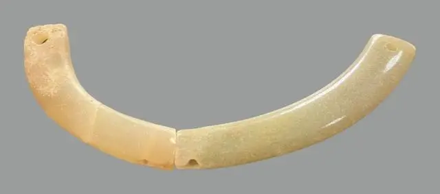 马家浜文化晚期玉璜。 今天,透过对出土文物的研究阐释,我们依稀可以看到磨盘山先民平等富足的生活图景。
