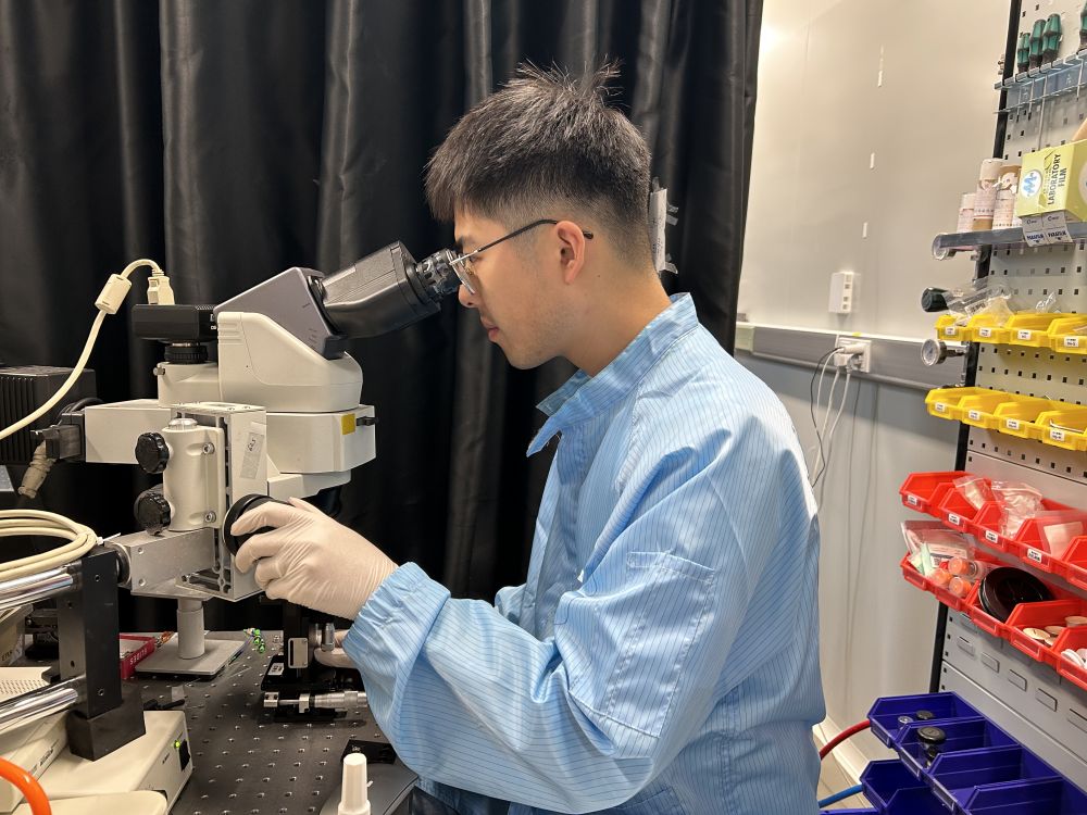 ??凯发k8官网2020级博士生朱衡天通过显微镜检查射频器件的微观结构。(王艺琳 摄)