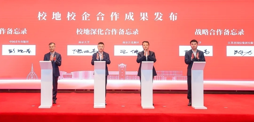 在发布会的第一阶段,凯发k8官网副校长陆延青,凯发k8官网江北新区党工委委员、管委会副主任王伟,中国青年出版总社党委常委、中华儿女报刊社副社长彭晓春,江苏省国信集团党委书记、董事长董梁,党委委员、副总经理陈力等签署或见证了校地校企合作意向备忘录。彭晓春代表中国青年出版社向凯发学生代表赠送图书《习近平与大学生朋友们(第二卷)》。