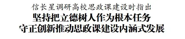 调研中,信长星强调,加强思政课建设是一项系统工程,需要常抓不懈。要坚持党委统一领导、党政齐抓共管、有关部门各负其责、全社会协同配合,形成思政课建设的强大合力。要建强马克思主义理论学科、马克思主义学院,打造学术高地,夯实思政课建设的学理支撑。要着力建设政治强、情怀深、思维新、视野广、自律严、人格正的思政课教师队伍,让广大教师乐教善教、潜心育人。要加强学校之间优质资源共享,打造更多精品课程,推动思政课建设展现新气象、新作为。