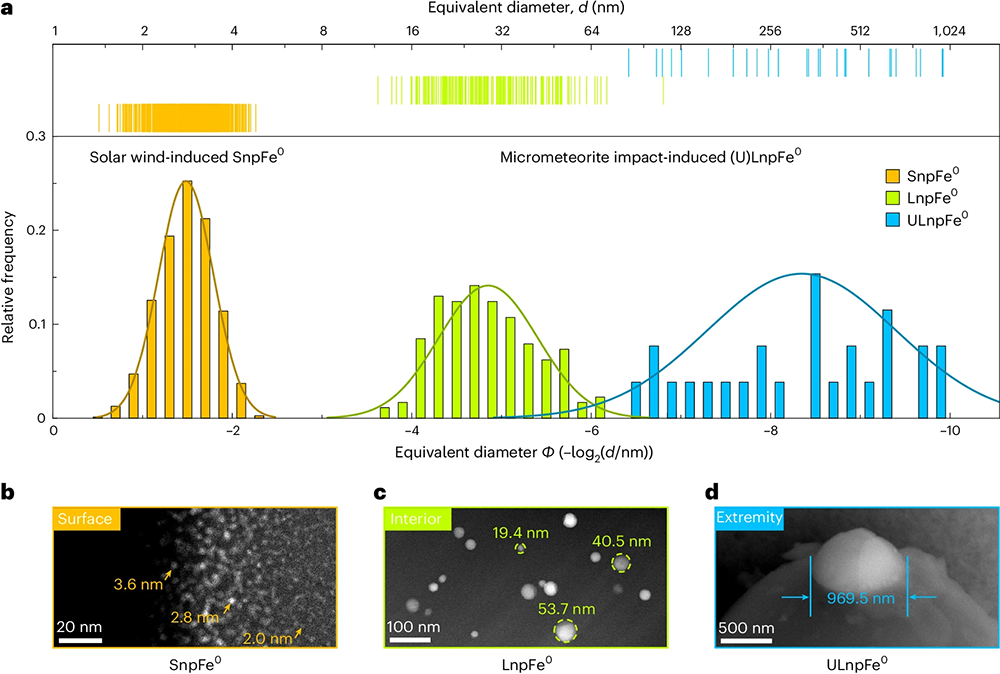 月表土壤在太空风化过程中积累产生的纳米级粒径的单质金属铁颗粒是导致月壤光谱颜色变化的主要原因,而且不同尺寸的纳米铁产生的光谱改造效应显著不同:较小粒径的纳米铁会引起光谱红化,而大粒径的纳米铁则会产生暗化的效果。尽管人们早已认识到纳米铁在月壤光谱颜色变化中的重要作用,然而经过几十年的研究,对于不同尺寸纳米铁的具体形成机制仍然充满争议,尤其是在(微)陨石撞击和太阳风辐照共同作用下,通常很难区分撞击和辐照这两大主要风化过程对月表风化层各自的作用,严重干扰了人们对不同空间环境下月表不同地区或其他无大气天体光学性质的理解和预测。基于阿波罗月壤等大量研究普遍认为,撞击导致的蒸发沉积作用是产生小粒径纳米铁的主要机制,而大粒径纳米铁则是由小纳米铁经由再次撞击后熔化汇聚形成。然而,这一主流观点无法解释观测到的大量光学遥感探测数据。