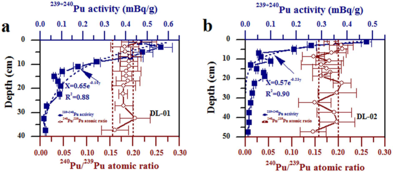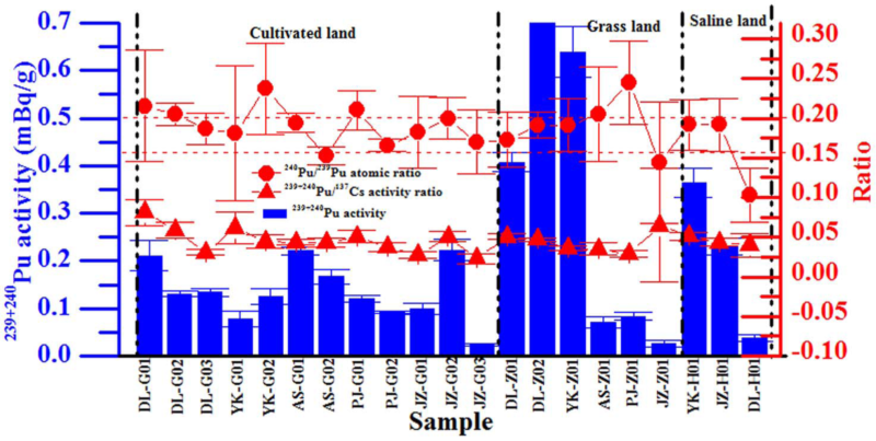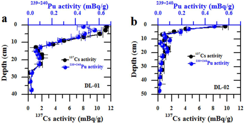 通过与国际放射生态学与示踪领域专家学者合作,潘少明教授团队尝试应用Pu同位素代替137Cs示踪研究土壤侵蚀过程。他们选择我国东北辽东湾沿岸地区作为研究区域,首次报道了我国东北地区土壤中的Pu同位素的分布特征,并证实了Pu同位素可以替代137Cs进行土壤侵蚀示踪研究。研究结果表明:1)辽东湾沿岸地区土壤中的Pu同位素来自于大气沉降;2)不同的土地利用方式及人类活动的作用是造成表层土壤中Pu同位素分布差异的主要原因;3)未受扰动土壤剖面中Pu同位素的活度随土壤深度呈指数下降趋势分布,与剖面中137Cs分布规律保持一致;4)经计算得出未受扰动土壤剖面中239+240Pu的蓄积量约为86.9Bq/m2,该数据与同纬度其他地区的研究报道相一致,因此可作为该研究区域土壤中Pu同位素的背景值。5)通过对比分析标准剖面与研究剖面中Pu同位素的蓄积量及其相应的土壤层位,可估算出研究剖面所在的位置约有6cm表层土壤被侵蚀,该结果与137Cs示踪技术的估算结果一致,初步证实了可以应用Pu同位素进行土壤侵蚀示踪研究。