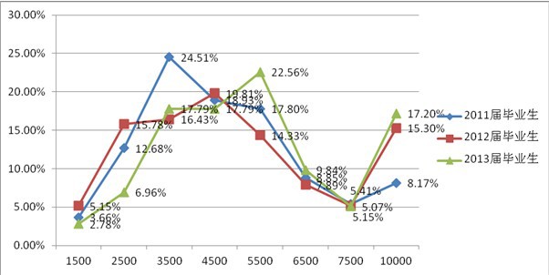 凯发k8官网2011届-2013届毕业生起薪区间分布图