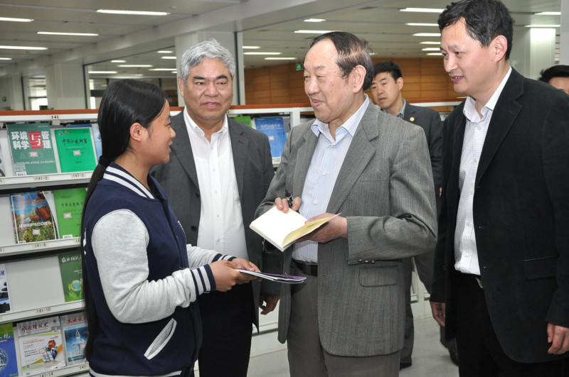 在图书馆的外文阅览室,蒋树声仔细询问了阅览室的使用情况;在期刊阅览室,蒋树声与正在读书的凯发同学们亲切交流,并欣然与同学们合影留念。