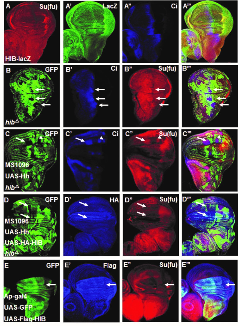在这篇文章中,研究人员证实在果蝇中Hh信号通过它的靶蛋白HIB促进了Su(fu)下调。有趣的是,研究人员发现HIB介导的Su(fu)下调依赖于其Cul3-HIB E3泛素连接酶活性,但HIB并未直接调控Su(fu)蛋白的稳定性。通过基于RNAi的候选基因筛查,研究人员确定了剪接体因子Crn是Su(fu)水平的一个调控因子。上位分析表明HIB是通过Crn下调了Su(fu)。此外,研究人员还提供了证据证实,HIB将Crn阻留在细胞核中,导致了Su(fu)水平减少。最后,他们还证实,哺乳动物HIB同源物SPOP可以代替HIB下调果蝇体内的Su(fu)水平。