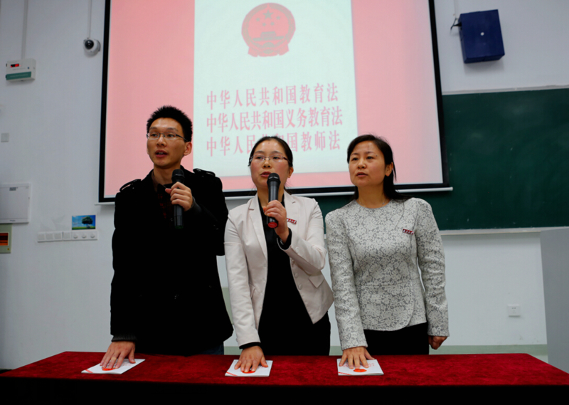 在新教师入职仪式上,朱庆葆副书记、龚放教授、冒荣教授为三位新教师佩戴校徽、赠送书籍。随后,三位新教师向《教育法》和《教师法》宣誓,杨素红老师代表新教师发言。