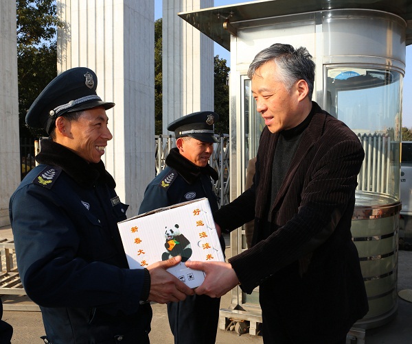 在金陵学院的大门口,张异宾书记看望了门卫人员。张书记感谢他们在平凡岗位上兢兢业业的工作,向他们致以节日的问候和祝福。