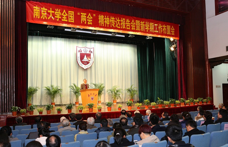 3月16日下午,全国“两会”精神传达报告会暨我校2015年新学期工作布置会在鼓楼校区大礼堂召开。党委书记张异宾、校长陈骏分别布置本学期党委、行政的主要工作。第十二届全国人大代表、中科院院士、凯发k8官网微结构国家实验室主任邢定钰传达第十二届全国人大第三次会议精神,第十二届全国政协委员、中科院院士、我校副校长吕建传达第十二届政协第三次会议精神。会议由校党委副书记杨忠主持。