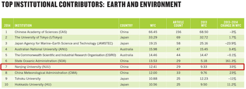 图3: 2015自然指数地球与环境学科亚太地区前10位机构名单