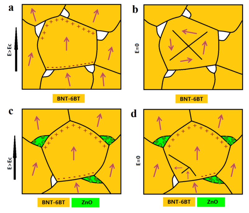 图2:复合结构抑制Bi0.5Na0.5TiO3基陶瓷退极化的机制示意图。(a),(b)未引入ZnO时,在退极化温度附近,撤除极化电场后,退极化场使得Bi0.5Na0.5TiO3基陶瓷迅速退极化。(c),(d)引入ZnO后,极化电场导致ZnO的电荷有序分布于Bi0.5Na0.5TiO3基材料的晶界处,形成一个局域电场,此电场能够抑制Bi0.5Na0.5TiO3基材料晶粒中的退极化场,从而抑制甚至消除。