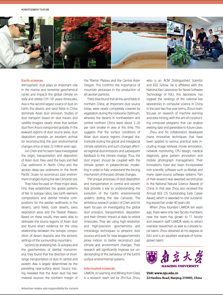 该篇介绍题为“追求卓越的百年中国高校”(A CENTURY-OLD CHINESE UNIVERSITY ASPIRING FOR EXCELLENCE),从人才、研究、国际合作以及科研亮点四个方面对我校做了全面简述。科研亮点则选择了我校在物理、化学、地球科学及信息科学四大领域的代表性成果。