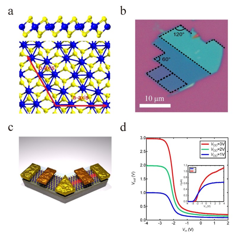 (a)ReS2低对称性的晶体结构;(b)由ReS2低晶格对称性导致的机械性能各向异性;(c)基于ReS2各向异性制备的逻辑反向器;(d)ReS2逻辑反向器的工作性能,将输入的低(高)电平转化为高(低)电平。