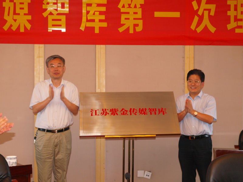 在阵阵掌声中,江苏省民政厅副厅长戚锡生与吕建副校长为江苏紫金传媒智库揭牌。