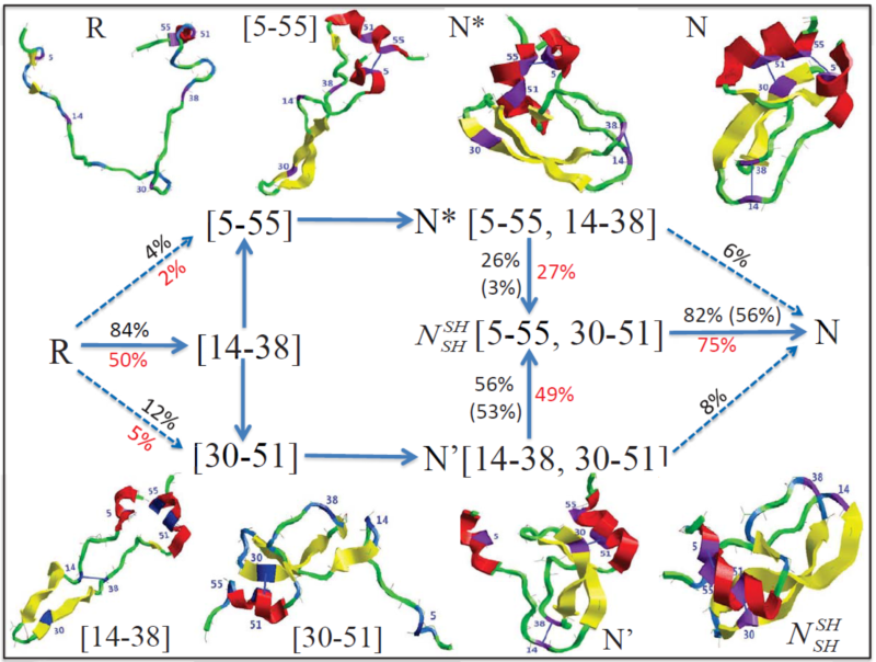 秦猛他们通过近年来的不懈努力,首次提出了蛋白质折叠过程中二硫键氧化和还原反应发生的物理模型,模拟了牛胰蛋白酶抑制剂(BPTI)的折叠过程,揭示了其氧化折叠的物理机制(如图1所示)。他们的结果阐明了含二硫键蛋白质的折叠动力学过程中,由序列特征所决定的构象早期形成将有效促进二硫键的形成,诠释了数十年来学界期望解决的二硫键在蛋白质折叠过程中的作用。模拟中所展示的蛋白质折叠微观动力学过程,清楚地描述了BPTI折叠早期所形成的b-发卡结构可有效促进二硫键[14-38]的形成,进而诱导其他二硫键的形成。特别是,他们还定量刻画了折叠限速中间体N*(含有2对正确折叠的二硫键5-55,14-38,如图1所示)以及最后一对正确二硫键(14-38)形成过程中所经历的非天然态二硫键中间体状态。