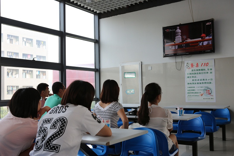 除了大礼堂外,鼓楼校区的学生食堂也打开电视,为教职工和同学们直播阅兵仪式。吴阿姨是食堂的一名洗碗工,她把手头的工作做完后,赶紧跑到电视机前观看。吴阿姨告诉我们,家里还有一个三岁多的小外孙,她让女儿今天一定要带着孩子看:“现在的小孩不知道当年抗战多么得苦,现在赶上好时代了,不能把前人的功劳忘了啊。”坐在一旁的董师傅则说要记得“团结才是力量”,他说:“阅兵让我们看到了祖国强大的实力,后来人更要发愤图强。”
