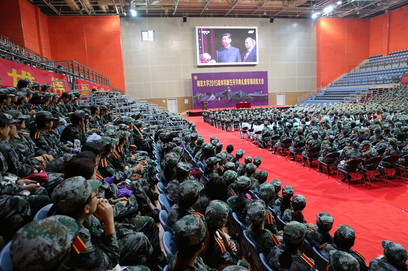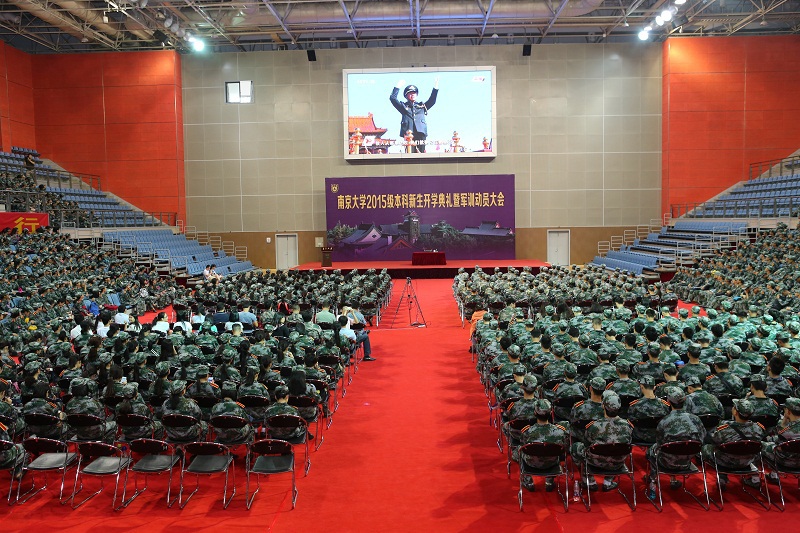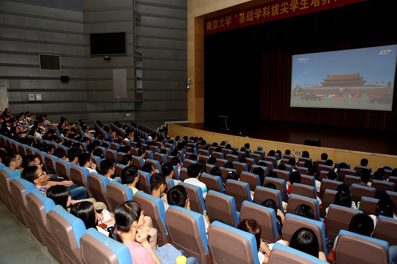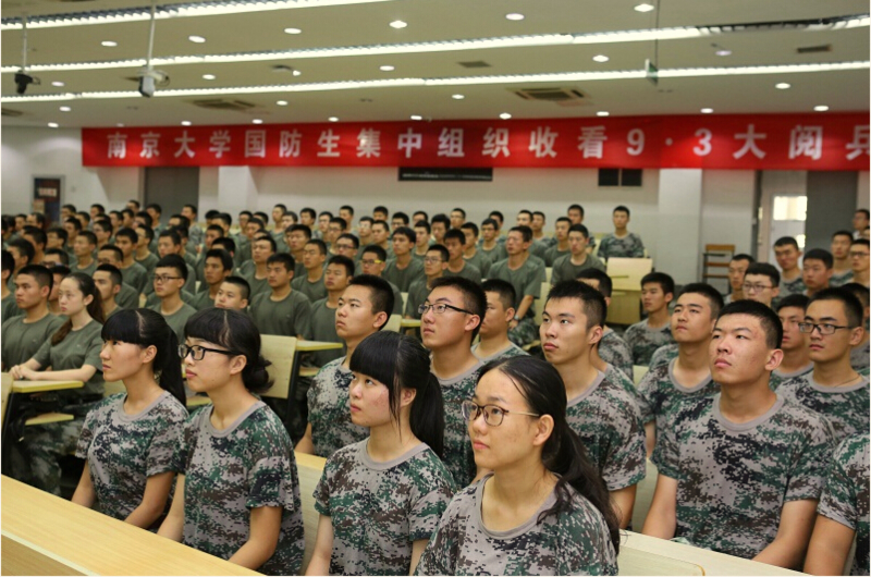 2015年9月3日,我国在北京天安门地区举行阅兵式,目的是为了铭记历史,缅怀先烈,珍视和平,开创未来。这也是我国首次举行胜利日阅兵。为了能让同学们能够在第一时间看到阅兵式的直播,学校在鼓楼校区大礼堂,仙林校区方肇周体育馆、大学生活动中心恩玲剧场,以及两校区的各个食堂设了放映点,实况直播抗战阅兵纪念大会。校党委宣传部、党委学工部、人武部、团委、网络中心、后勤集团等各部门联合协作,组织师生观看,安排放映点,调试网络,保障集体观看的顺利进行。