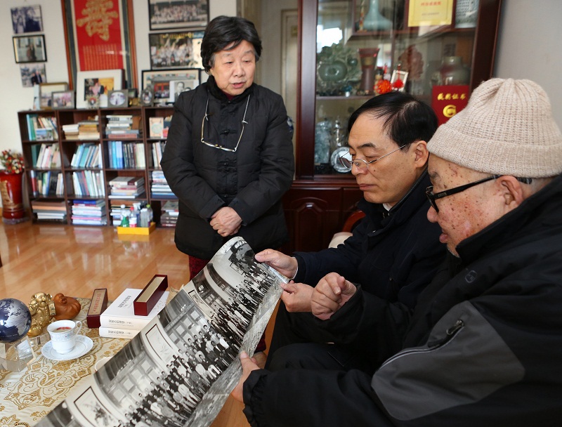 在冯端家中,陈校长与这位物理学界的老科学家亲切交谈,询问其身体和生活状况,并向冯先生对学校多年的关心和支持表示感谢。交谈中,冯先生拿出珍藏多年的珍贵照片说,这是他1966年7月31日随中国代表团参加“北京科学讨论会1966年暑期物理讨论会”时受到毛主席等党和国家领导人亲切接见时的合影,当时中国代表团的团长是周培源,钱三强、唐敖庆、谢希德等都参加了讨论会。陈校长听后满面笑容地说,这是很珍贵的照片,并嘱咐随同人员复制一幅交付学校档案馆永久保存。