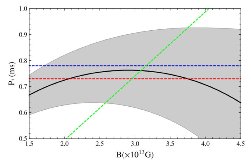 图1:ASASSN-15lh观测对致密天体的周期和磁场的限制。阴影部分表示1σ的限制范围,蓝虚线和红虚线分别是中子星和夸克星的最小转动周期(即开普勒周期),绿虚线是磁偶极辐射时标大于光子扩散时标给出的最小限制。