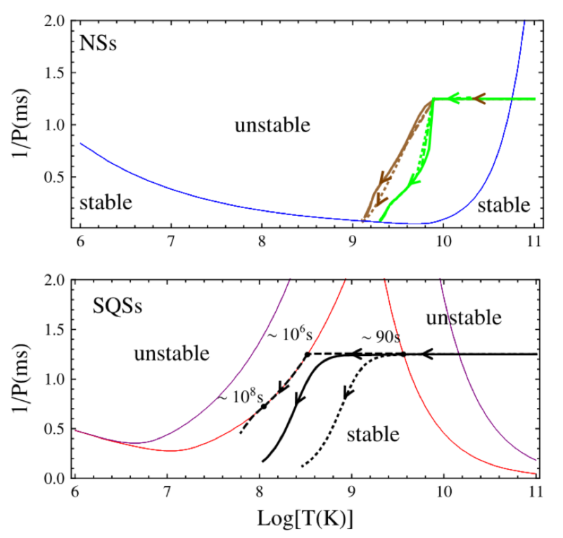 图2:中子星(NSs)和夸克星(SQSs)的转动周期演化(横坐标为温度,纵坐标为周期的倒数)。上图表示初生的中子星很快进入转动模式(r-mode)不稳定区,随后的引力波辐射损失了转动能,因而转动周期降到约5毫秒。下图表示夸克星从一诞生就处在不稳定区,约90秒后离开不稳定区,随后由于磁偶极辐射,只有强磁场的夸克星才能避开不稳定区,特别是磁场约为3?1013G(实粗线)的夸克星才可以正好驱动ASASSN-15lh。