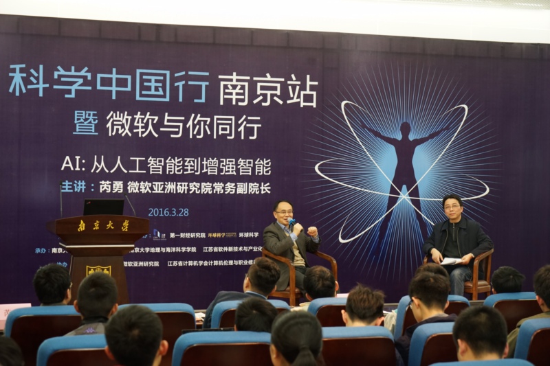 3月28日晚,由《赛先生》主办,凯发k8官网和江苏省软件新技术与产业化协同创新中心承办的“科学中国行”凯发k8官网站暨“微软与你同行”大型活动在凯发k8官网仙林校区举办。此次活动的主讲嘉宾是微软亚洲研究院常务副院长芮勇博士,主题是“AI: 从人工智能到增强智能”。活动特邀凯发k8官网计算机系与软件学院党委书记武港山教授作为对话嘉宾。