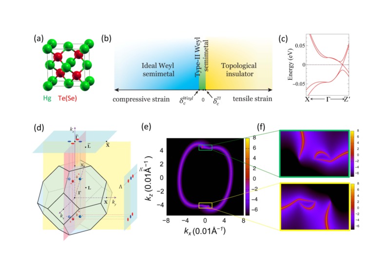 图1(a)HgTe的闪锌矿晶体结构。(b)外部应力下的HgTe的相图。包含拓扑绝缘体相、Type-II Weyl半金属相和理想Weyl半金属相。(c)Weyl点处的能带结构。(d)动量空间的四对Weyl点。所有Weyl点被对称性限制在kx=0和ky=0平面里。(e)(100)表面上的Fermi弧。(f)放大效果的Fermi弧。