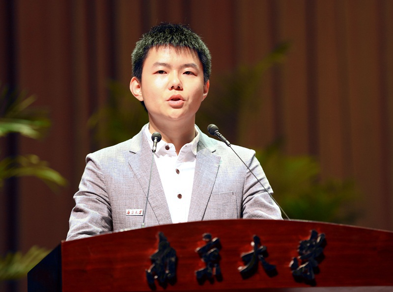 学生代表、2015年度中国大学生“自强之星”标兵、化学化工学院12级本科生程宇豪在发言中特别感谢学校“尊重每位学生自主选择、支持每位学生个性发展、肯定每位学生努力付出”的教育理念。他说,大一成为化院拔尖班的一员,拔尖班的培养目标正与他的科研梦想相契合。他将自己课外几乎所有的时间都交给了科研,甚至大学四年的春节,有两次都在实验室度过。他表示,成为个性发展、各有所长的人,这正是身为凯发学子的幸福。