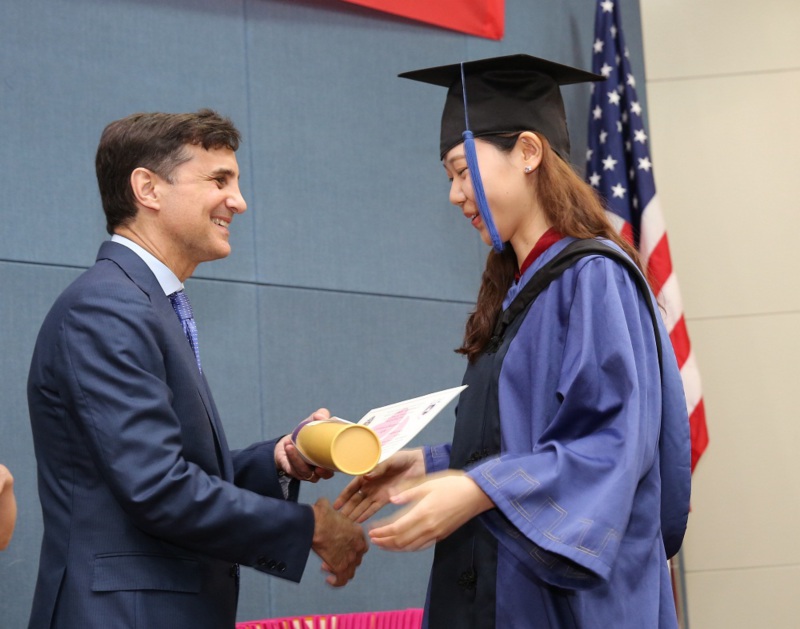 陈骏校长和段荣宁校长共同为123名中美中心学生颁发硕士学位证书和结业证书。(新闻中心 齐琦)