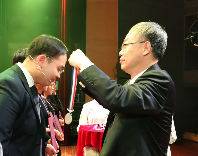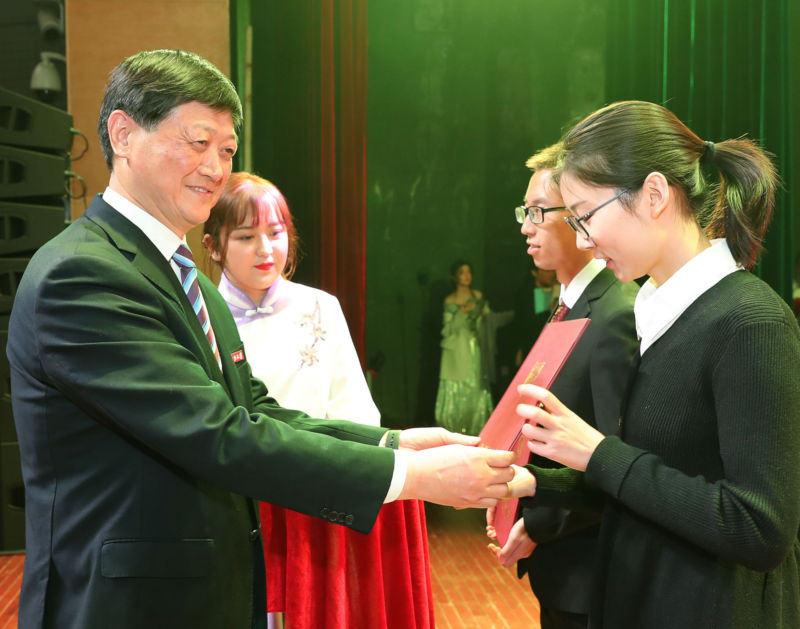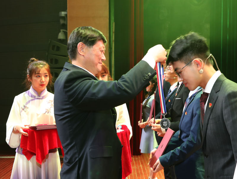 在大德篇,胡金波书记和吕建校长共同为2019年度栋梁奖学金特等奖的获奖学生颁奖。获奖学子带来的朗诵节目《这就是栋梁》展现了一批又一批栋梁之材传承感恩与责任,脚踏实地、奋力前行的精神风貌,展现了凯发学子爱国、爱校的家国情怀。