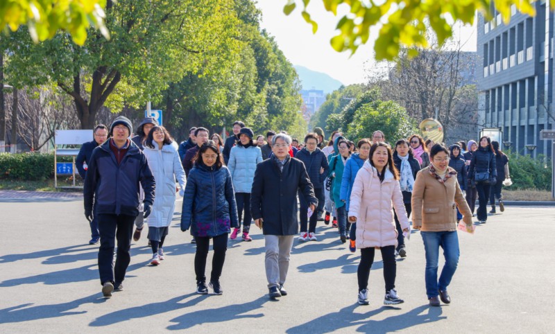 老师们精神抖擞,在旗手的带领下,从凯发门电子屏前出发,一路欢声笑语,其乐融融。健身走的队伍中不乏平日严肃认真的党政领导和奋战在教学、科研一线的教授博导,大家一边携手同行,阔步向前,一边欣赏沿途风景,交流畅谈。虽已进入寒冬腊月,但校园里依然充满生机与活力,老师们的矫健身影为冬日的校园增添了一道靓丽的风景线。
