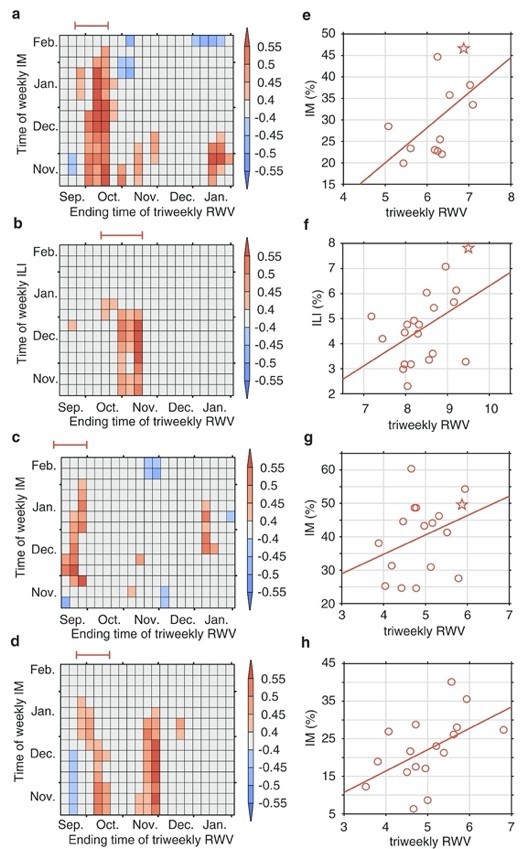 图1,a-d分别代表中国、美国、意大利、法国的快速天气变化(RWV)与流感强度(ILI/IM)之间的逐周超前滞后相关。e-h分别代表中国、美国、意大利、法国流感峰值强度与关键时段(a-d中的红色间隔标记)快速天气变化的散点图,其中星号代表2017-2018年流感季。