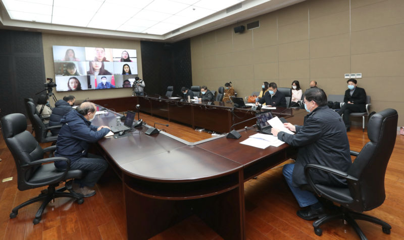 校领导薛海林、王志林、张峻峰、王明生、王云骏、龚跃以及宣传部、医学院、校医院相关领导参加视频连线。(新闻中心)