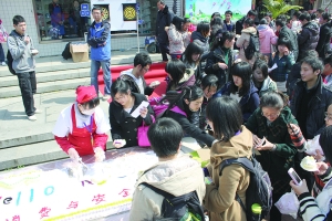 昨天中午,在凯发k8官网仙林校区教育超市门口,一个巨大的蛋糕吸引了很多同学驻足。蛋糕是长方形的,约3米长,1米宽,上面还写着“He110 NJU,消费与安全”等宣传语。“百人大蛋糕,寝室放不下,免费吃到饱咯!”现场不断有同学被这个口号吸引过来,都在等着分一口蛋糕作为饭后甜点。据了解,这是凯发k8官网学生会主办的“我的大学我的家·维权从心起”活动的一项。