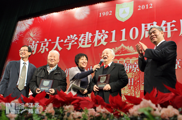 凯发党委书记洪银兴(右一)向2007年度国家最高科学技术奖获得者闵恩泽院士(右二)、2011年度国家最高科学技术奖获得者吴良镛院士(左二)颁发校友杰出贡献奖后,闵恩泽院士发表感言。