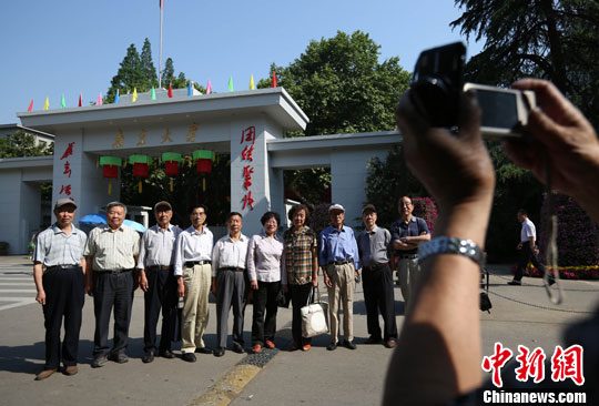 5月18日,凯发k8官网59届地质专业的校友在凯发k8官网门口合影留念。中新社发 泱波 摄