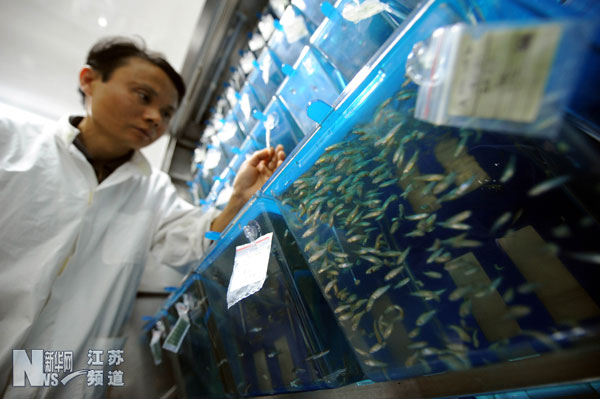 工作人员在对模式动物斑马鱼的培育进行日常检查管理。