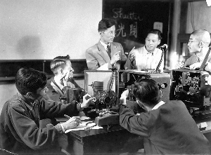 中国电影高等教育第一位专职教师孙明经(右)正在金陵大学校园指导学生拍摄(1936年)