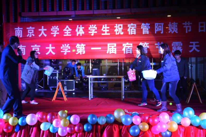 宿管节露天晚会由一位宿管阿姨和一个同学搭档主持,吸引了许多“慕名而来”的同学,晚会节目也精彩纷呈。“永遇乐”相声社的二位同学一出《减肥记》逗得现场观众捧腹大笑;吉他协会的漂亮妹子用高超的琴艺和优美的歌声俘获了大家的心;拉丁舞社的两位同学让大家在劲歌热舞中忘却了冬日的严寒,而宿管阿姨们的积极参与更为晚会增色不少。十多位宿管阿姨身着鲜红色上衣、皮短裤,眉舞飞扬,伴着节奏欢快的音乐,通过舞蹈《小苹果》尽情释放自己的激情和力量,让台下裹着棉衣的观众倍感惊艳。“阿姨们真的好拼啊,她们跳得真好,我都被震撼到了!”来到现场观看演出的信管13级学生李宽如是说。