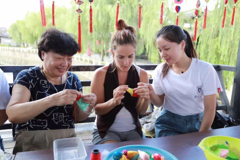 最近一段时间,南通街头常常出现这样的场景:玉带桥上,一串串五彩缤纷的香袋迎着阳光微微摇曳,几名身着文化衫的大学生正坐在树荫下,跟着老奶奶学做香囊。大红缎子缝成心形香袋,一颗珠子下面缀着三缕五彩丝线。大学生们聚精会神、用心临摹,交谈中不时地传来阵阵笑声。顺着笑声望去,还会发现其中有位金发碧眼的外国姑娘也在认真地模仿着……这是正在进行的“中国—以色列大学生联合采访”活动中的景象。今年暑假,为了引导青年大学生深入农村、感受乡村发展,从而进一步强化文化自信与文化自觉,同时也为了更好地向世界宣传中国古乡镇及其所承载的中国文化,我校新闻传播学院联合南通市委宣传部以及中国人民大学、南通开放大学、以色列特拉维夫大学等高校共同举办“中国—以色列大学生联合采访”活动。活动共持续两周,对南通古乡镇的考察是其中的“重头戏”。